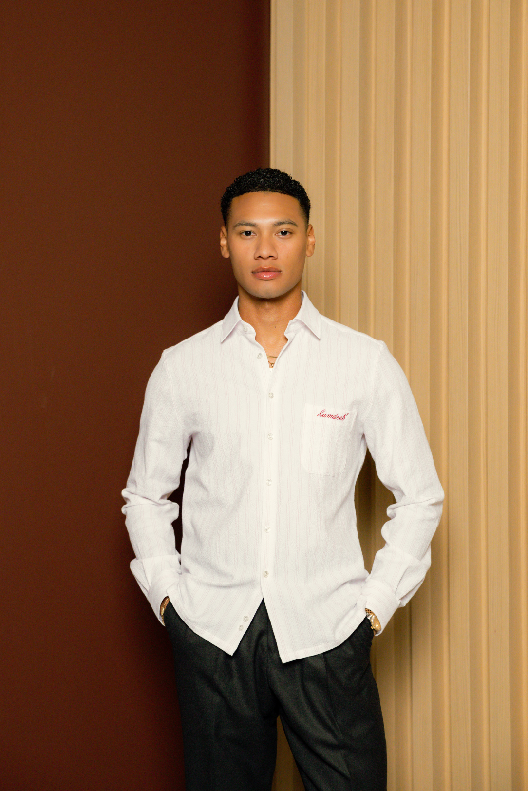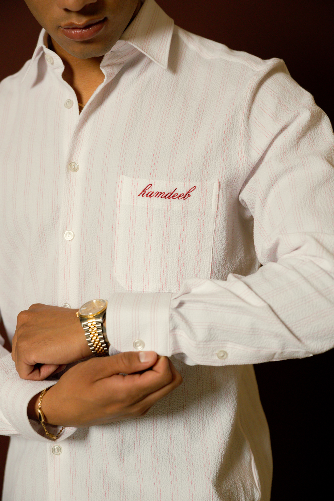 The seersucker shirt is crafted from lightweight, textured shirting, chosen for its soft drape and exceptional breathability, finished with a branded Ham Deeb monogram on the chest pocket.